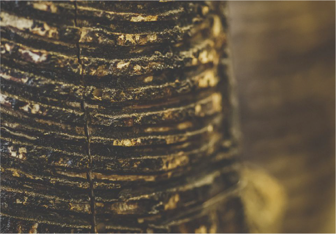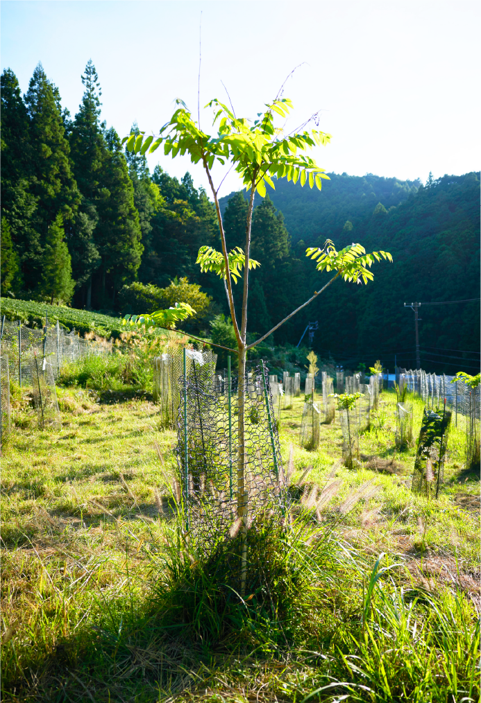 漆は日本において縄文時代より活用され、漆器の製造技術は独自に発展を遂げました。また、かつて日本国内各地でウルシノキが栽培されていましたが、戦後、石油化学の発展に伴い減少の一途をたどりました。ELEMUSは、大学や研究機関と連携し自社でウルシノキの栽培に着手、これまで不可能とされていたウルシノキの人工発芽に世界で初めて成功しました。現在、その苗を愛知県の中山間地へ植樹し、栽培をすすめています。ウルシノキは発芽後15年程度で、樹液を採取できるようになることから、長期的に安定した資源供給が可能であり、私たちが生きている時間軸の中で循環させることが可能です。また、ウルシノキは他の樹木に比べて成長が早いことから、CO₂の吸収量(固定化)が多いと考えられており、環境保護の観点からも評価されています。