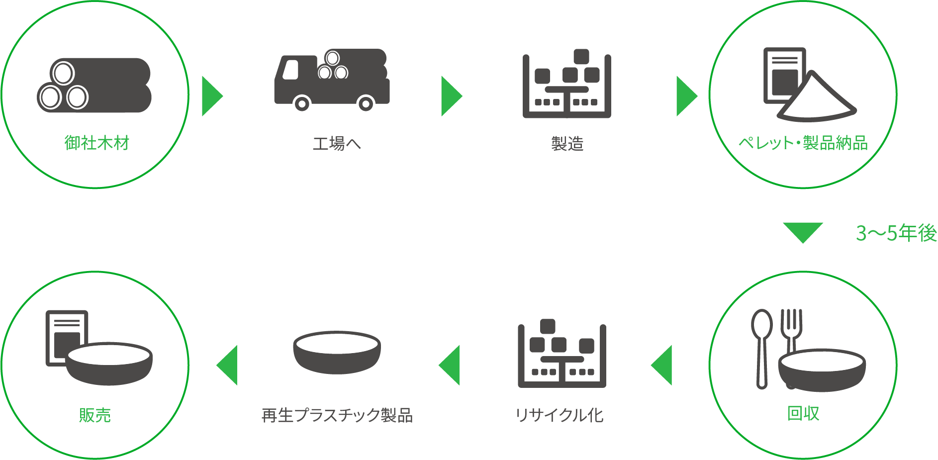 地域産の木材や竹から、きのこプ・たけのこプを作ることができます。自社で生産したきのこプ・たけのこプは、3年~5年後に、弊社がすべて買い取り、リサイクルして別の商品へ作り直しますので、地域内での資源循環を目指しています。