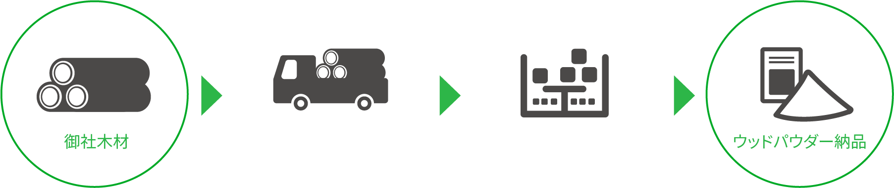 ELEMUSの木粉は、全国の産地との直接取引により、国内産木材のみをご提供します。主に間伐材や建築端材などを木材業者から購入し、独自技術で微粉砕化してご提供いたします。